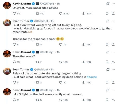 比赛中,火箭球员阿门·汤普森与鹈鹕球员阿尔瓦拉多爆发肢体冲突,前NBA球员埃文·特纳随后在个人社媒批评阿门不冷静,杜兰特随后现身评论,两人展开了对线。