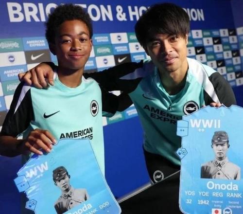 11月27日,布莱顿组织青训学院参加英超休战活动,三笘薰与一位日裔的黑人小球员一起合影。然而令人震惊并且愤怒的是,两人举着的卡片上赫然印着日本二战战犯小野田宽郎的照片!